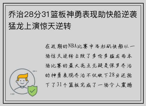 在近期的NBA比赛中,洛杉矶快船以一场惊天逆转击败了多伦多猛龙,而本场比赛的最大亮点无疑是保罗·乔治的神勇表现。乔治不仅砍下28分,还抢下了31个篮板,完成了一场令人震撼的全能表演,助力快船从落后局面...