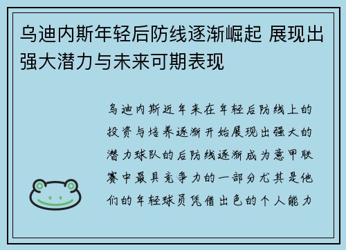 乌迪内斯近年来在年轻后防线上的投资与培养逐渐开始展现出强大的潜力。球队的后防线逐渐成为意甲联赛中最具竞争力的一部分,尤其是他们的年轻球员,凭借出色的个人能力和团队配合,展现出了令人瞩目的发展潜力。文章...