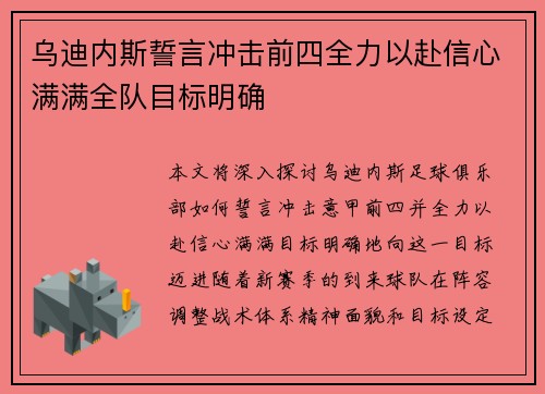 本文将深入探讨乌迪内斯足球俱乐部如何誓言冲击意甲前四,并全力以赴、信心满满、目标明确地向这一目标迈进。随着新赛季的到来,球队在阵容调整、战术体系、精神面貌和目标设定等多个方面做出了重要部署,誓言通过不...