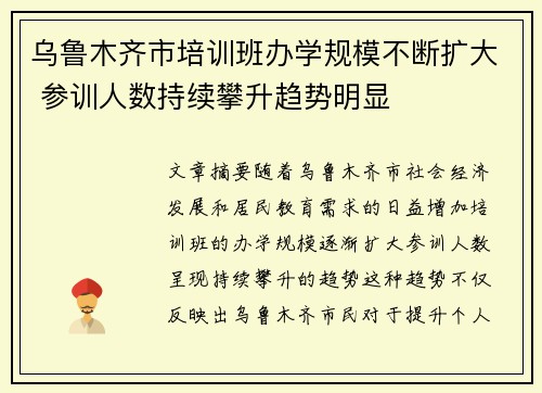 文章摘要:随着乌鲁木齐市社会经济发展和居民教育需求的日益增加,培训班的办学规模逐渐扩大,参训人数呈现持续攀升的趋势。这种趋势不仅反映出乌鲁木齐市民对于提升个人技能、实现职业发展的迫切需求,也体现了政府...