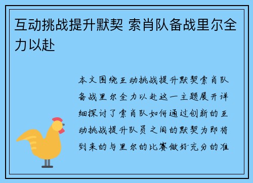 本文围绕“互动挑战提升默契,索肖队备战里尔全力以赴”这一主题展开,详细探讨了索肖队如何通过创新的互动挑战提升队员之间的默契,为即将到来的与里尔的比赛做好充分的准备。文章从四个方面进行阐述,首先介绍互动...