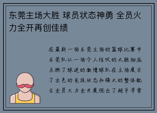 在最新一场东莞主场的篮球比赛中,东莞队以一场令人惊叹的大胜彻底点燃了球迷的激情。球队在主场展示了出色的竞技状态和强大的整体配合,全员火力全开,展现出了超乎寻常的竞技水平。从球员的状态到战术布局,再到对...