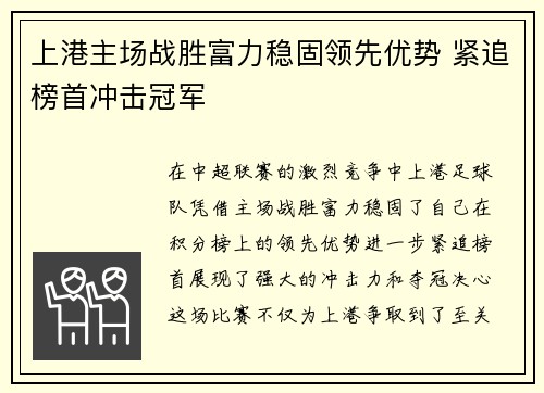在中超联赛的激烈竞争中,上港足球队凭借主场战胜富力,稳固了自己在积分榜上的领先优势,进一步紧追榜首,展现了强大的冲击力和夺冠决心。这场比赛不仅为上港争取到了至关重要的3分,更加巩固了他们在联赛中的地位...