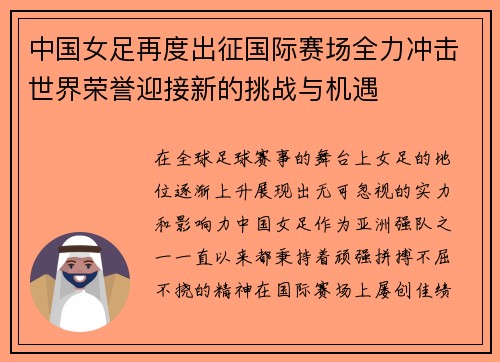 在全球足球赛事的舞台上,女足的地位逐渐上升,展现出无可忽视的实力和影响力。中国女足,作为亚洲强队之一,一直以来都秉持着顽强拼搏、不屈不挠的精神,在国际赛场上屡创佳绩。随着新一轮国际赛季的到来,中国女足...