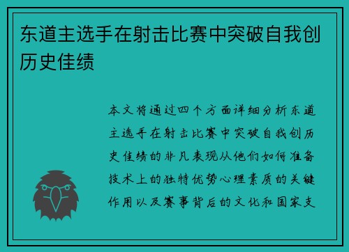 本文将通过四个方面详细分析东道主选手在射击比赛中突破自我创历史佳绩的非凡表现。从他们如何准备、技术上的独特优势、心理素质的关键作用以及赛事背后的文化和国家支持等方面进行阐述,展示出一位东道主选手是如何...