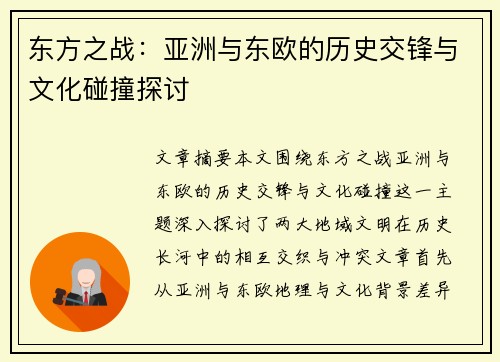 文章摘要: 本文围绕“东方之战:亚洲与东欧的历史交锋与文化碰撞”这一主题,深入探讨了两大地域文明在历史长河中的相互交织与冲突。文章首先从亚洲与东欧地理与文化背景差异出发,分析了两者的文明基础及其形成过...