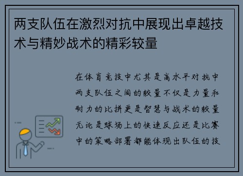 在体育竞技中,尤其是高水平对抗中,两支队伍之间的较量不仅是力量和耐力的比拼,更是智慧与战术的较量。无论是球场上的快速反应,还是比赛中的策略部署,都能体现出队伍的技术水平和战术素养。本文将通过分析两支队...