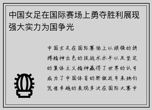 中国女足在国际赛场上以顽强的拼搏精神、出色的技战术水平以及坚定的集体主义精神赢得了世界的认可,成为了中国体育的骄傲。近年来,她们凭借卓越的表现,多次在国际大赛中取得优异成绩,为国争光。在中国女足的征战...