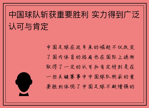 中国足球在近年来的崛起不仅改变了国内体育的格局,也在国际上逐渐取得了一定的认可和肯定。特别是在一些关键赛事中,中国球队斩获的重要胜利,体现了中国足球不断增强的实力。这些胜利不仅提升了中国球队的信心,也...