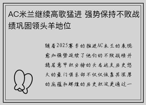 本文将围绕AC米兰近期在意甲的连胜势头,分析该队为何能够稳居榜首,并展现出强劲的冠军之姿。从球队的战术创新到球员的出色表现,再到主帅的决策能力,AC米兰在本赛季展现出了强大的竞争力。文章将从四个方面进...