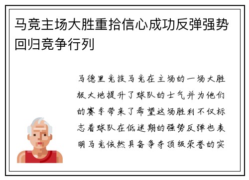 马德里竞技(马竞)在主场的一场大胜,极大地提升了球队的士气,并为他们的赛季带来了希望。这场胜利不仅标志着球队在低迷期的强势反弹,也表明马竞依然具备争夺顶级荣誉的实力。通过这场比赛,马竞重拾了信心,并通...