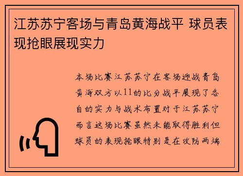 本场比赛,江苏苏宁在客场迎战青岛黄海,双方以1:1的比分战平,展现了各自的实力与战术布置。对于江苏苏宁而言,这场比赛虽然未能取得胜利,但球员的表现抢眼,特别是在攻防两端的表现令人印象深刻。青岛黄海虽未...