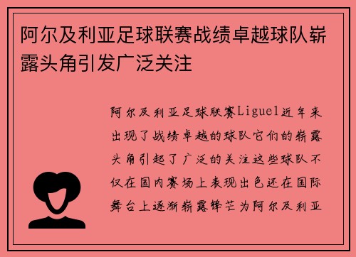 阿尔及利亚足球联赛(Ligue 1)近年来出现了战绩卓越的球队,它们的崭露头角引起了广泛的关注。这些球队不仅在国内赛场上表现出色,还在国际舞台上逐渐崭露锋芒,为阿尔及利亚足球注入了新的活力。在这篇文章...