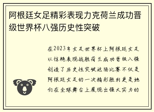在2023年女足世界杯上,阿根廷女足以惊艳表现战胜荷兰,成功晋级八强,创造了历史性突破。这场比赛不仅是阿根廷女足的一次精彩胜利,更是她们在全球舞台上展现出强大实力的标志。本文将从四个方面详细分析阿根廷...