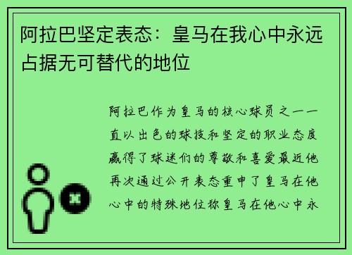阿拉巴作为皇马的核心球员之一,一直以出色的球技和坚定的职业态度赢得了球迷们的尊敬和喜爱。最近,他再次通过公开表态,重申了皇马在他心中的特殊地位,称皇马在他心中永远占据无可替代的位置。这一表态不仅彰显了...