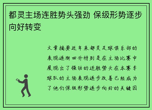 文章摘要:近年来,都灵足球俱乐部的表现逐渐回升,特别是在主场比赛中展现出了强劲的连胜势头。在本赛季,球队的主场表现逐步改善,已经成为了他们保级形势逐步向好的关键因素之一。本文将详细分析都灵主场连胜的原...