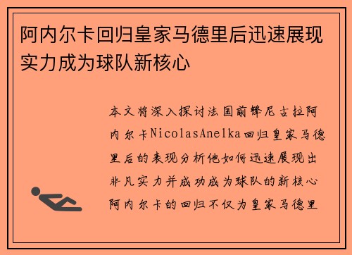 本文将深入探讨法国前锋尼古拉·阿内尔卡(Nicolas Anelka)回归皇家马德里后的表现,分析他如何迅速展现出非凡实力,并成功成为球队的新核心。阿内尔卡的回归,不仅为皇家马德里注入了急需的活力,也...